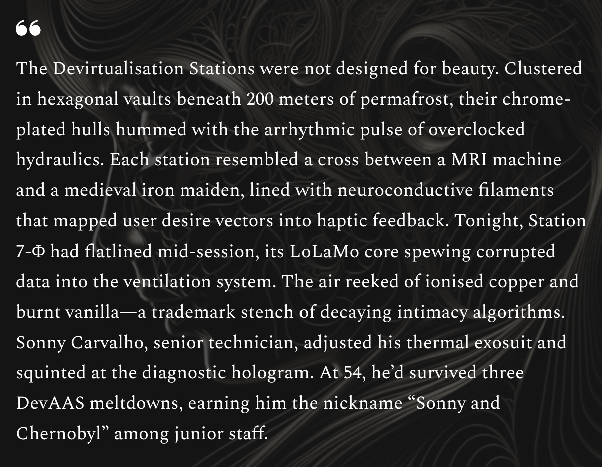 A series of speculative fictions titled Love Language Models which are included in an anthology called Entanglements, published by Posthuman Press. You can read some out-takes from those sessions elsewhere on these pages.