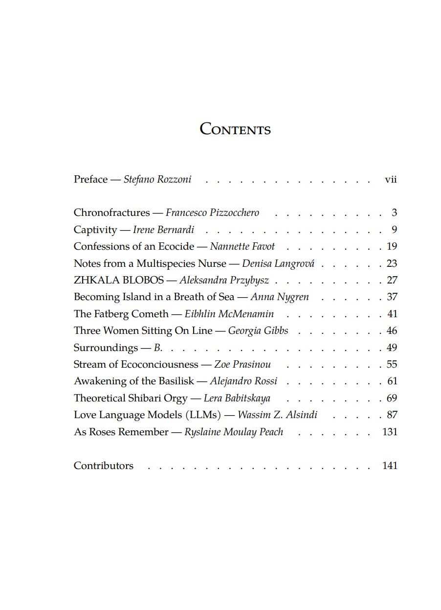 A pornodelirium where an urban multiplicity, a deceased eros, materialises into a suffocating, technological macro-organism; a golden creature cracks the self parallel to the mass production of animals; a multispecied nurse narrates her relationship with ravens, jays and an orphaned kestrel in a Wild Animal Rescue Station; a drain technician is contaminated by fatbergs; extinction is conceived as a kinky burial party in an erotic elegy; while a love algorithm’s technical malfunctions represents an existential threat to users. From erotic prose to programming, the multimodal tales and illustrations in this volume invite the reader to dive into posthuman co-existence.